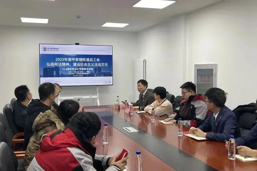 浩天律师事务所合伙人、党员律师姜山赫在呼家楼街道总工会的协调安排下,为多家企事业单位职工做12.4国家宪法日专题普法讲座。他从宪法的定义、宪法的历史、宪法的作用、生活中的宪法以及典型案例等方面,深入浅出地讲解宪法内容,为企业职工普及宪法知识。