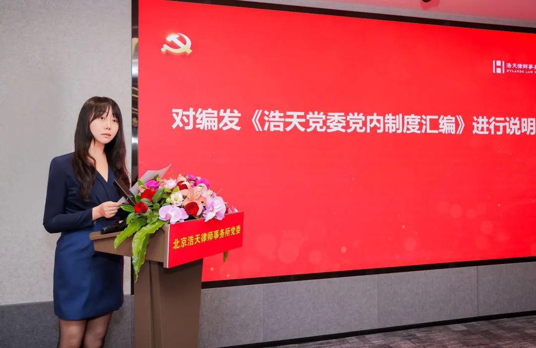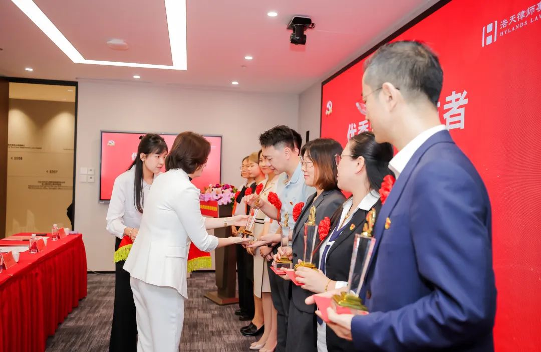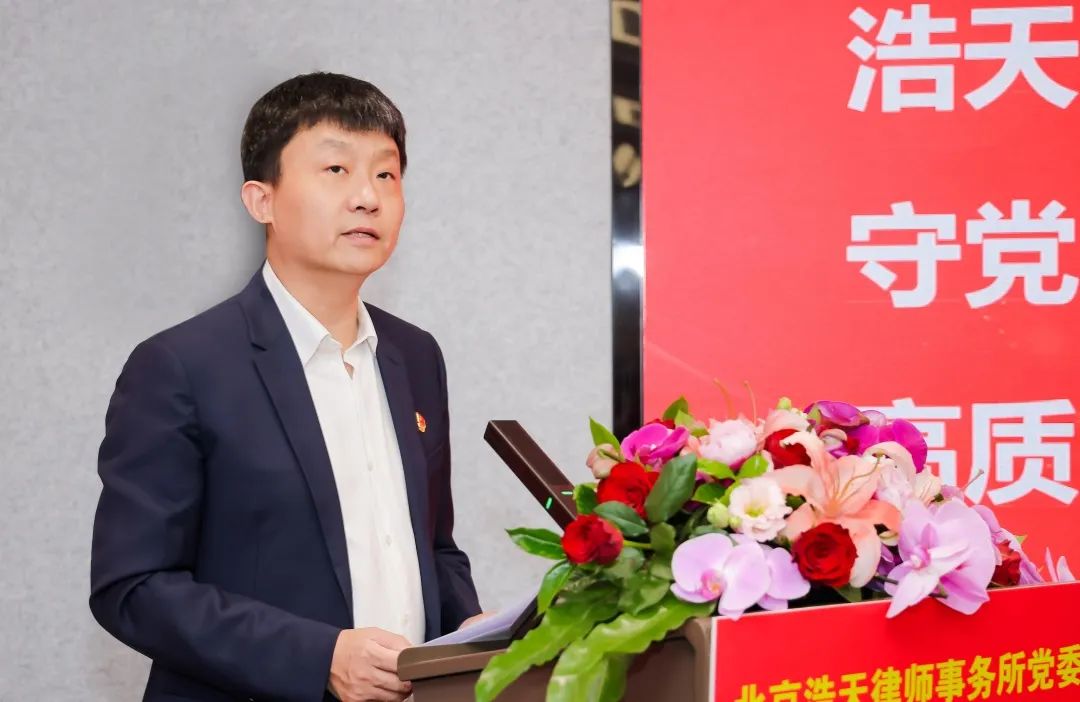徐羽同志充分肯定了浩天党组织建设和党员队伍建设取得的成效。他指出,浩天党委成立以来,以加强党委班子自身建设、加强党内基本制度建设、加强党支部政治功能和组织力建设、加强党员党性教育为重要切入点,党建机制高效顺畅,党的制度大力夯实,党的组织有效覆盖。实现了党建引领下各方面工作的有效提升。2023年到2024年,律所规模不断扩展、结构不断优化、业绩稳中有进。今年5月份,律所首次颁布了五年度《社会责任报告》,首次编印了《浩天党委党内制度汇编》。在党建工作上,逐步形成了“引领靠班子、管理靠制度、公益强赋能、首都带地方”的浩天特色党建 。广大党员在业务领域、行业领域、“万民党员律师助社区,人民满意我先行”等法律公益服务方面法义承载、不忘初心,行业美誉度、专业知名度、群众满意度不断提升。党员律师已成为律师队伍的一支重要骨干力量,为浩天律所发展做出了重要贡献。徐羽同志代表党委对受到表彰的个人和组织表示衷心祝贺!对奋战在律师一线的全体党员致以衷心感谢!