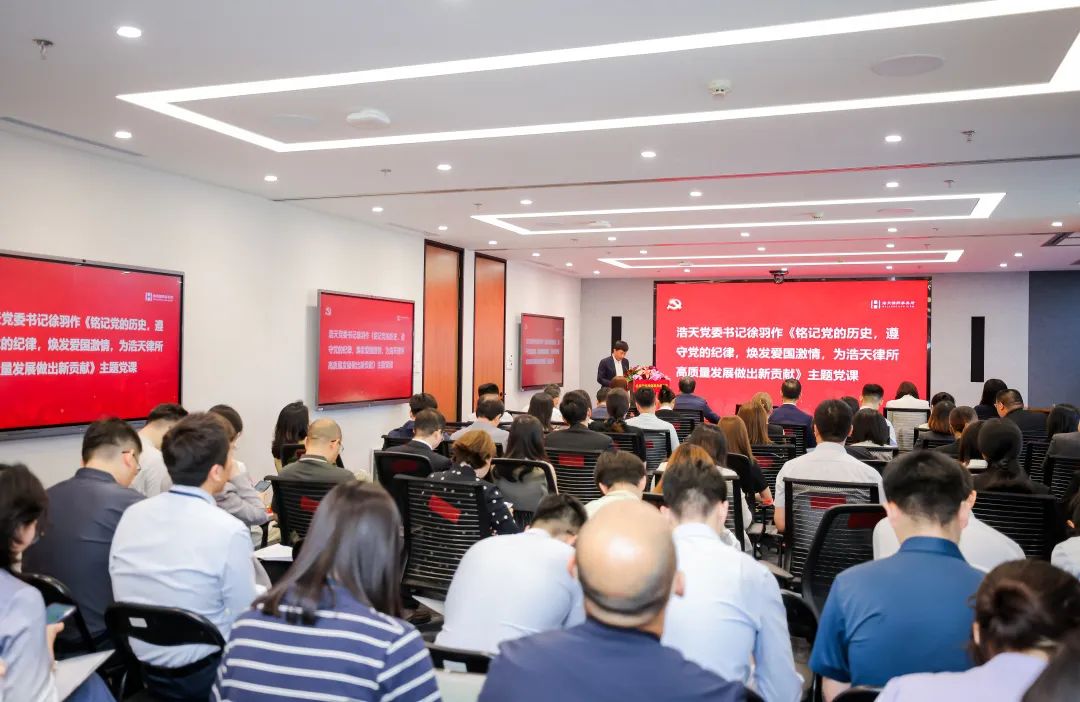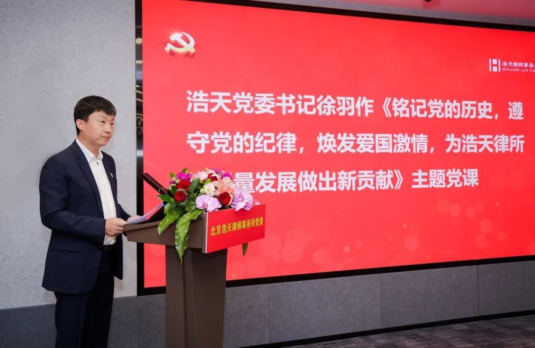 最后,浩天党委书记、管委会主任徐羽同志向全体党员作了《铭记党的历史,遵守党的纪律,焕发爱国激情,为实现浩天律所高质量发展做出新贡献》主题党课。