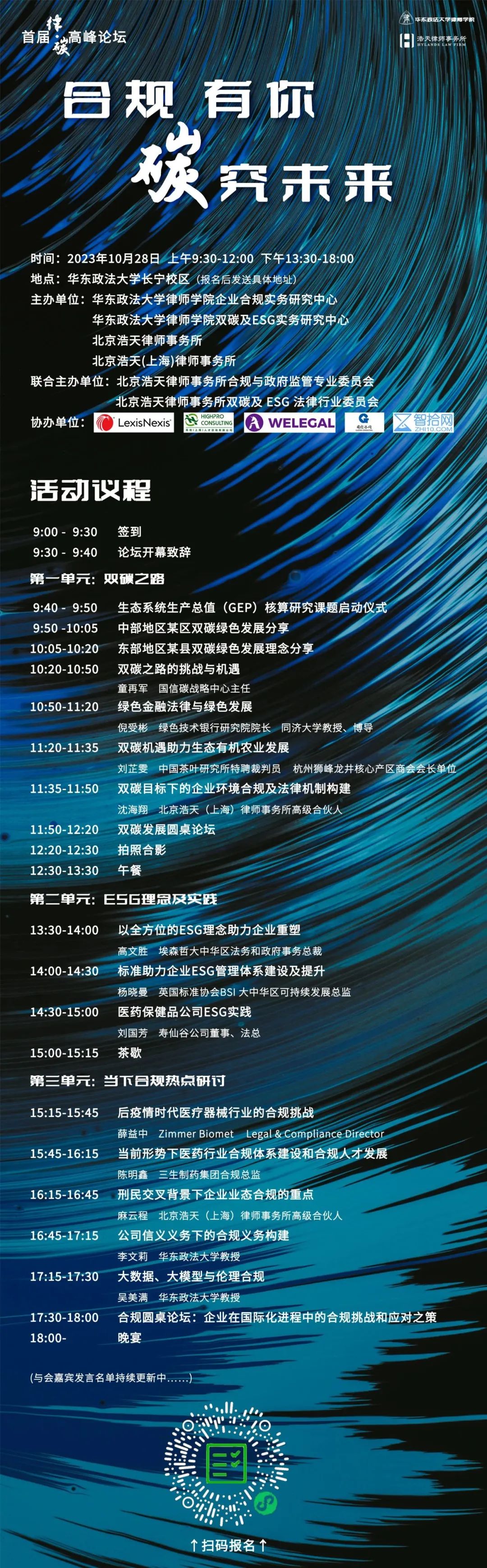 为响应国家在企业合规和双碳及ESG领域的大势所趋,华东政法大学律师学院联合北京浩天(上海)律师事务所建立企业合规实务研究中心和双碳及ESG实务研究中心,发起律·碳系列高峰论坛,旨在致力于搭建企业合规、双碳及ESG法律理论与实践相结合的产、学、研一体化可持续发展平台,为政府、高校、研究机构、商业机构、社会组织以及公众提供全方位的企业合规、双碳及ESG法律咨询和研发服务!