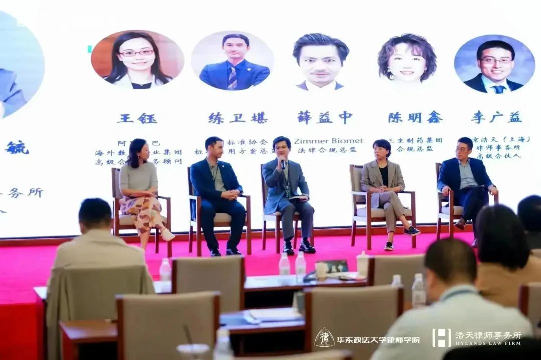 最后,由浩天上海办公室高级合伙人陶毓律师作为主持人,进行了主题为“企业在国际化进程中的合规挑战和应对之策”的圆桌论坛探讨。阿里巴巴海外数字商业集团高级合规法务顾问王钰,英国标准协会标准应用方案总监练卫堪,Zimmer Biomet 法律合规总监薛益中,三生制药集团合规总监陈明鑫,浩天上海办公室高级合伙人李广益作为嘉宾参与了本次圆桌论坛讨论。
