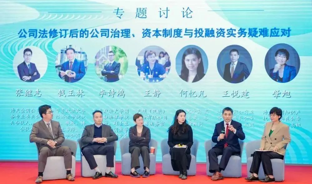 专题分享环节后,与会嘉宾就“公司法修订后的公司治理、资本制度与投融资实务疑难应对”开展专题讨论。讨论由浩天全国公司业务专业委员会牵头合伙人及北京浩天律师事务所高级合伙人张继志主持,由华东政法大学经济法学院院长、教授、博士生导师及中国法学会商法学研究会常务理事钱玉林,天顺风能(苏州)股份有限公司首席法务官王静,IMAX中国高级副总裁及总法律顾问何忆凡,浩天全国公司业务专业委员会牵头合伙人及浩天(上海)律师事务所高级合伙人王悦建,浩天全国知识产权专业委员会牵头合伙人及北京浩天(上海)律师事务所高级合伙人肇旭共同参与。研讨现场气氛热烈,各界专业人士就新公司法修订后的实务疑难问题的应对思路进行了积极分享,集思广益,达成共识。