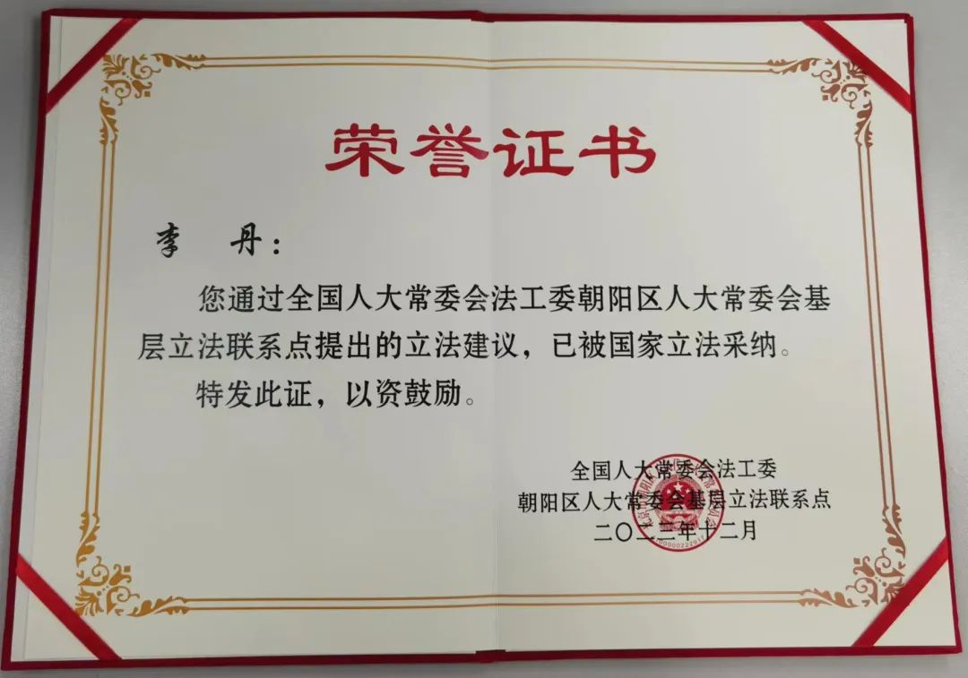 该立法建议被纳入《十四届全国人大常委会公布的未来五年立法规划》(“第一类项目:条件比较成熟、任期内拟提请审议的法律草案”)。该机构为李丹律师颁发了国家立法采纳的荣誉证书和纪念奖牌,同时该立法建议还被纳入全国人大常委会法工委朝阳区人大常委会基层立法联系点立法意见建议光荣册。