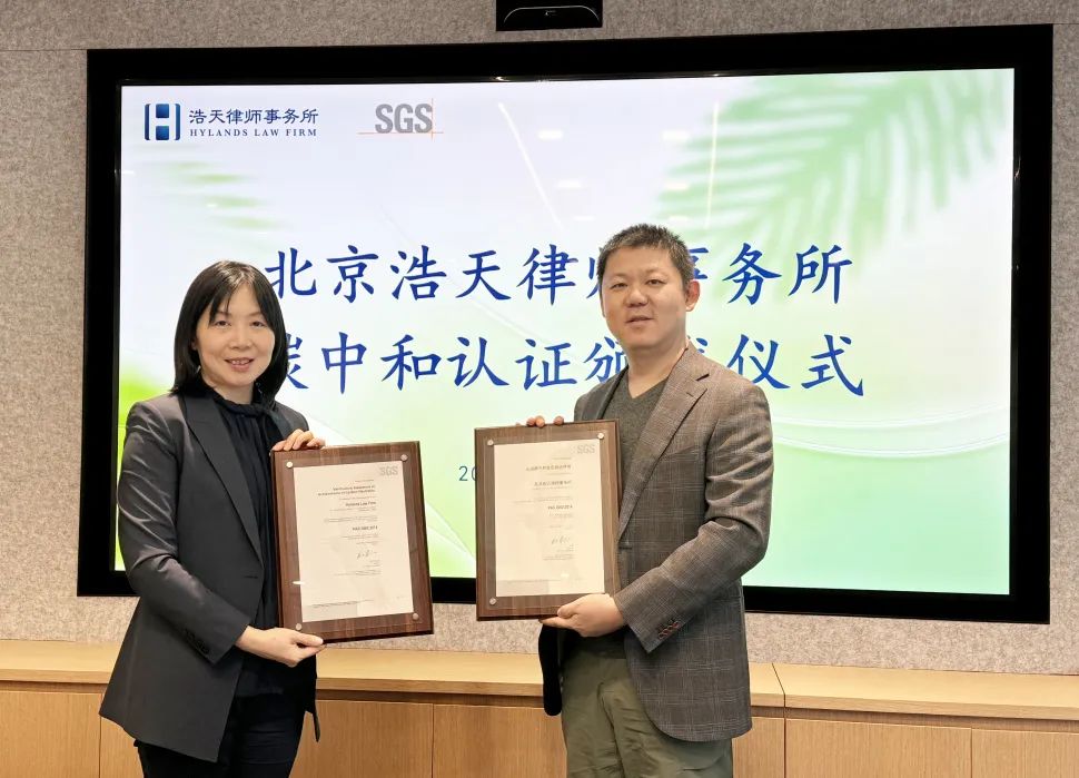 通过国际知名测试、检验和认证机构SGS的核查,北京浩天律师事务所荣获PAS 2060碳中和达成宣告核证证书。此次认证标志着北京浩天律师事务所正式迈入碳中和机构行列。贾一鹏律师代表浩天律师事务所领取这一荣誉。