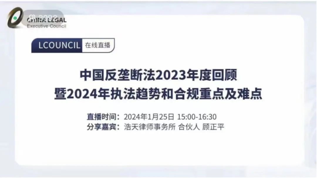 2024年1月25日下午,由北京浩天(上海)律师事务所主办、LCOUNCIL协办的《中国反垄断法2023年度回顾暨2024年执法趋势和合规重点及难点》的专题讲座以线上直播方式举行。来自各行各业的公司法总、资深法务总监、合规主管和业务主管等三千余名嘉宾参加了本次线上讲座。