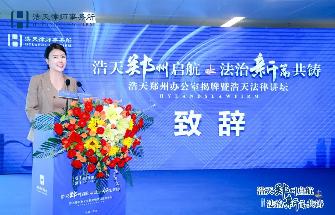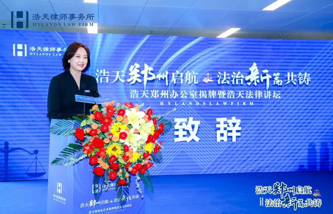 浩天郑州办公室创始合伙人、律所主任徐瑞聪对各位领导、嘉宾和朋友的到来表示热烈的欢迎和衷心的感谢。她表示浩天郑州办公室的成立和揭牌仪式的筹备着实不易,从2023年5月18日落地到今天的揭牌,每一位浩天郑州办公室的合伙人、全体同事都付出了巨大的努力,因为有了这样的共同团结克服困难的经历,浩天郑州办公室将会更加团结一致,奋力拼搏,铸就更为辉煌的成绩。她还表示,浩天郑州办公室将秉持“抱朴守正 至诚四达”的初心,致力于将浩天郑州办公室发展成为一家以法律专业为核心,以高质量服务客户为追求,以争议解决为特色,以追求公平正义推动法治建设为目标的综合性律师事务所。