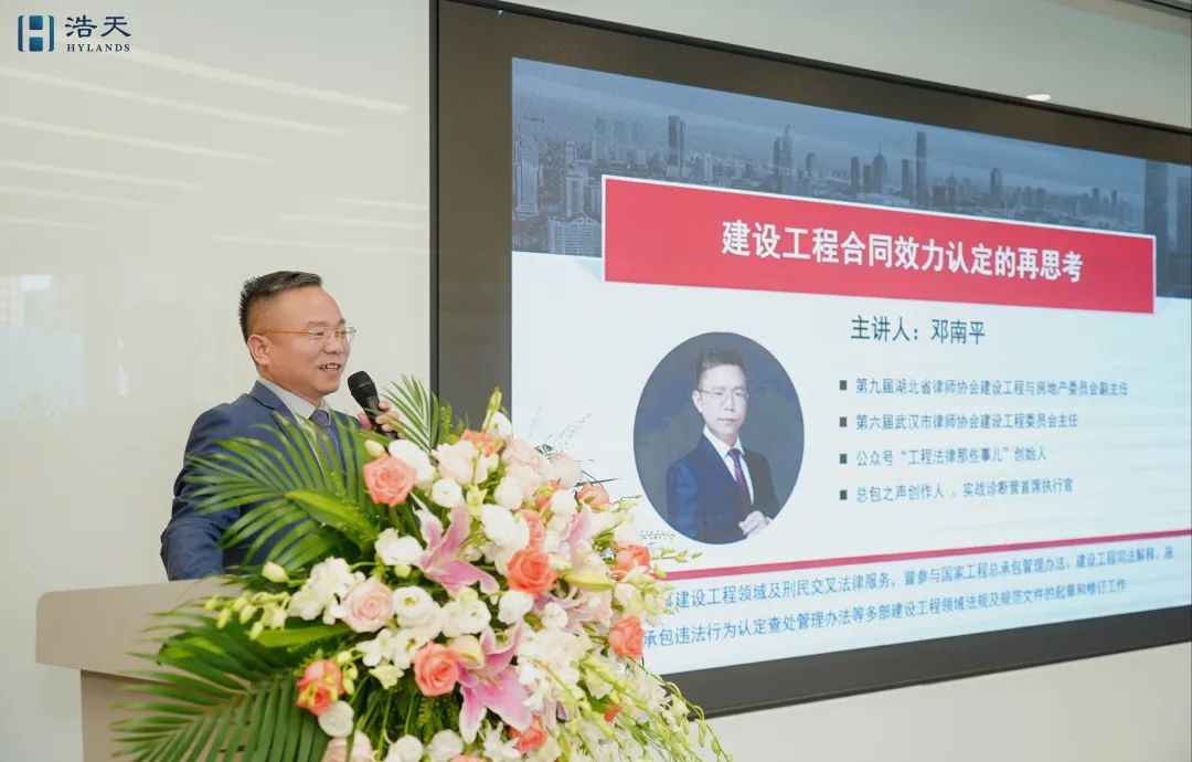 北京浩天(武汉)律师事务所高级合伙人邓南平律师以“建设工程合同效力认定的再思考”为题,解析建设工程合同效力,涵盖招投标、虚伪意思、多份合同及公章问题,深度探讨法律适用与实践。