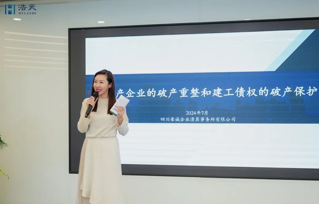 四川豪诚企业清算事务所有限公司总经理秦丽萍以“债务清收的方法创新”为主题,以房地产企业破产重整如何应对债务危机为切入点,为大家详细解析保护企业建工债权,实现资产保值增值的具体操作,并期待之后与浩天成都办公室加强合作,为企业提供专业的法律服务。