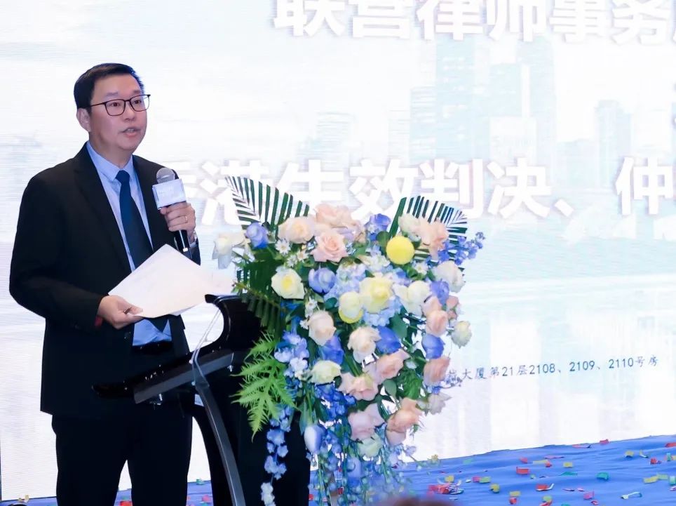 深圳市律师协会副会长罗振辉发表致辞,在这个充满活力与机遇的深圳前海共同见证一个意义非凡的时刻。并衷心祝愿向前海联营所在未来的日子里乘风破浪,再创辉煌,成为跨境法律服务行业的标杆和典范。