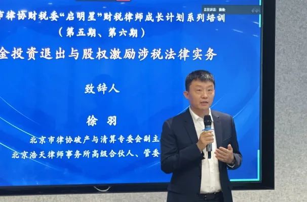 北京市律师协会财税法专业委员会(以下简称"专委会")发起的“启明星”税务律师系列培训之“基金投资退出与股权激励涉税法律实务”,于2024年12月13日在浩天北京办公室成功举办。本次活动邀请了北京律协领导、专委会主任及成员、北京市范围内相关律师、京津冀三地律协财税委部分委员,及新疆和田地区律师同仁线上线下参加。