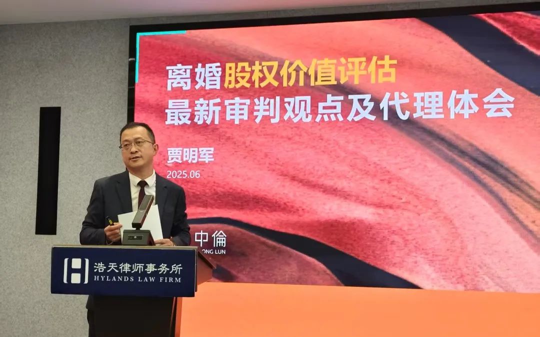 贾明军律师发表了《离婚股权价值评估的最新审判观点及代理体会》的主题演讲,结合真实案例和实务中离婚案件股权评估的难点和司法审判中的不同意见,对律师代理涉股权类案件的注意事项进行解读,分享代理中“挖掘隐形资产线索”“运用专家辅助人制度”的实操技巧,为离婚财富分割争议提供破局思路。贾律师幽默又务实的分析,将此次活动推向了高潮。