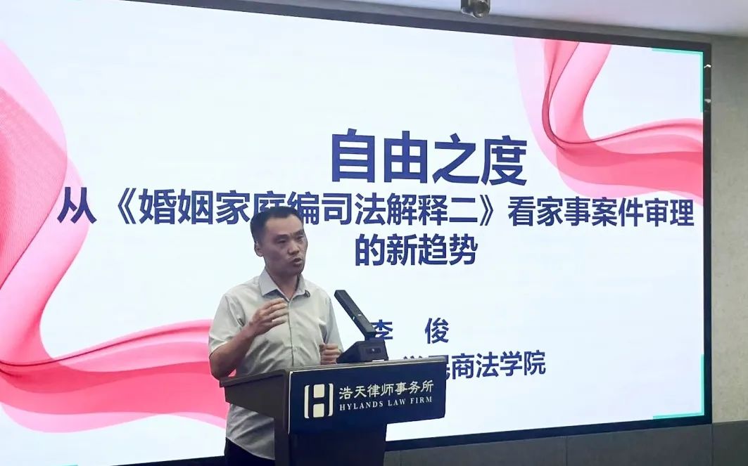 李俊教授以《婚姻家庭编司法解释二》为切入点,发表了《自由之度——从<婚姻家庭编司法解释二>看家事案件审理新趋势》的主题演讲,对司法解释二正式实施对审判工作工作的影响进行了解读。他以同居析产案件处理为例,从同居关系中财产分割的法律规定变化入手,结合司法审判实践,分析了新的司法解释对未来家事审判方向的“场景细化、考虑多元”影响。李俊教授的演讲打开了家事律师在代理案件时对新规定下审判思路的理解,让大家受益匪浅。