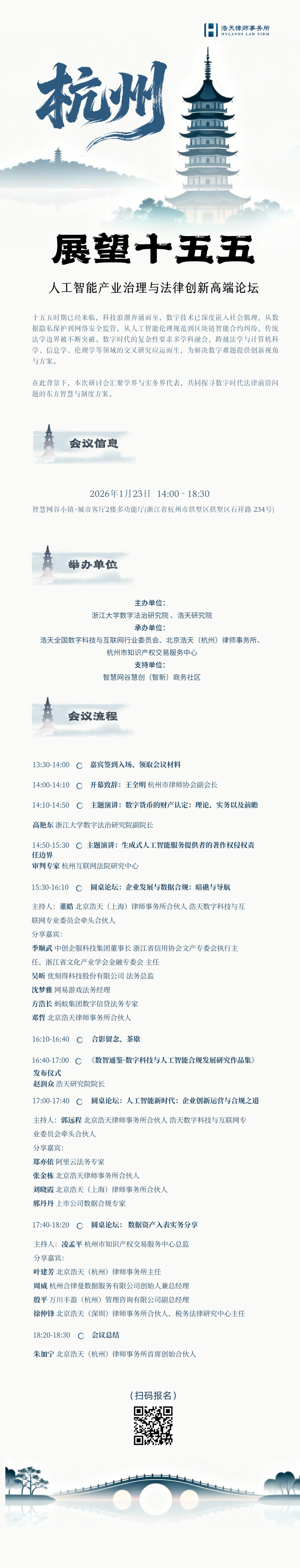 浩天与浙江大学数字法治研究院、杭州市知识产权交易服务中心特此共同举办“人工智能产业治理与法律创新高端论坛”,汇聚来自高校、头部科技企业、顶尖律所及法律科技机构的权威专家展开深度对话,更有重磅研究成果《数智通鉴·数字科技与人工智能合规发展研究作品集》现场首发!