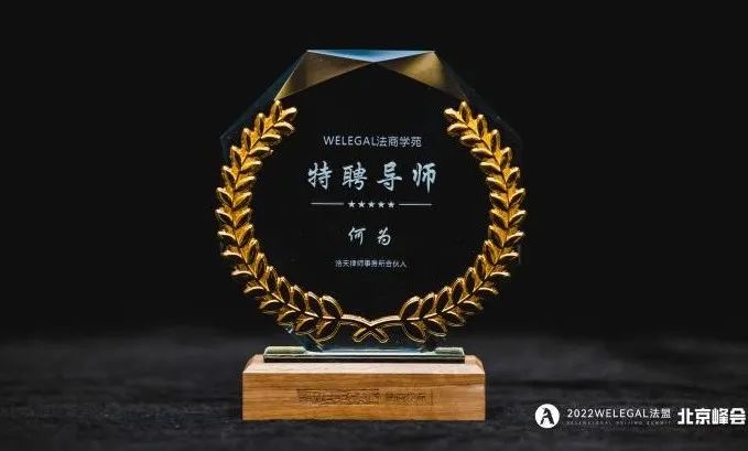 峰会主办方举行了“WELEGAL法商学苑特聘导师授予仪式”,为19位优秀的合伙人律师、法律科技专家、行业专家颁发了导师证书。何为律师作为特聘导师上台领奖。