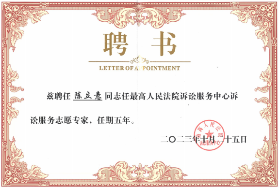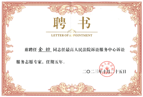 北京浩天律师事务所高级合伙人刘盈子律师、合伙人余昉律师以及律师陈立意通过中国法学会组织推荐、审核及备案,作为诉讼服务志愿专家获得了最高人民法院诉讼服务中心颁发的聘书,任期为五年,自2023年10月起至2028年10月止。
