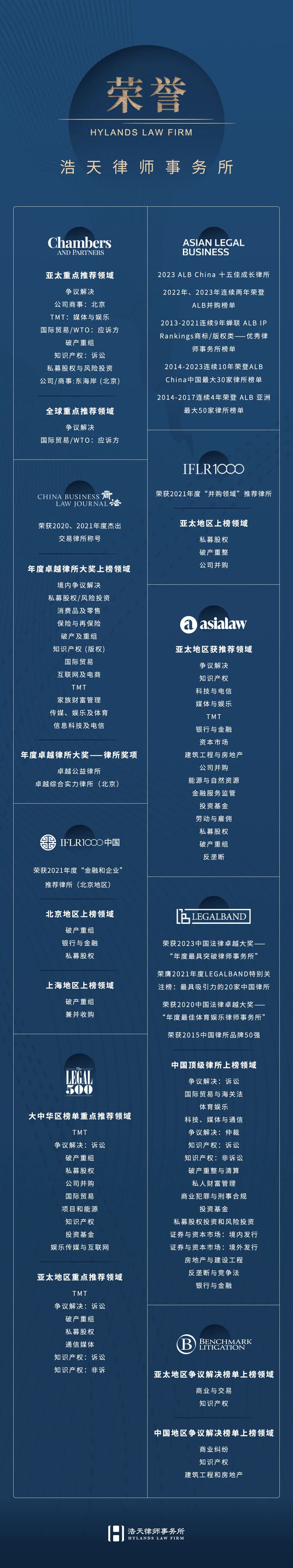 2026年3月4日,《商法》(China Business Law Journal)公布了2025年度杰出交易名单,北京浩天律师事务所合伙人牟菲律师代理的“协信远创及关联公司重整”案获评2025《商法》“年度杰出交易Deals of the year-清算、破产与重组”案件;北京浩天律师事务所合伙人沈倩律师代理的“中国钢产业成功应对马来西亚调查”案获评2025《商法》“年度杰出交易Deals of the year-国际贸易调查”案件;北京浩天律师事务所合伙人朱志彤律师代理的“超聚变百亿股权投资项目”获评2025《商法》“年度杰出交易Deals of the year-私募股权与风险投资”案件。