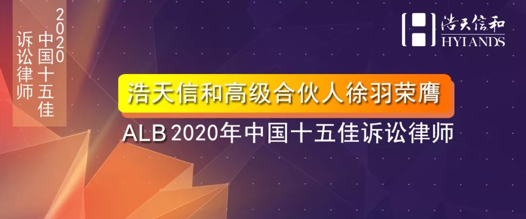 2020年2月20日,在《亚洲法律杂志》(ALB)最新发布的“2020中国十五佳诉讼律师”榜单中,浩天信和管委会主任、高级合伙人徐羽律师以在争议解决、破产、重整及特殊资产处置等领域多年丰富的经验和杰出的执业表现荣登榜单。