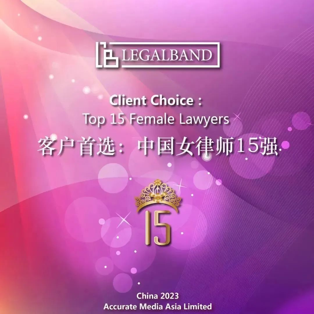 LEGALBAND是国际媒体公司Accurate Media旗下的专业法律评级机构,总部位于香港,在中国大陆拥有驻地调研团队。本次评选,LEGALBAND重点参考了各大律所的推荐材料、律师自荐材料以及客户反馈信息等,同时结合其中国区驻地调研团队对中国女律师群体的长期关注与洞察,最终选出15位中国大陆地区最受客户青睐的女律师。