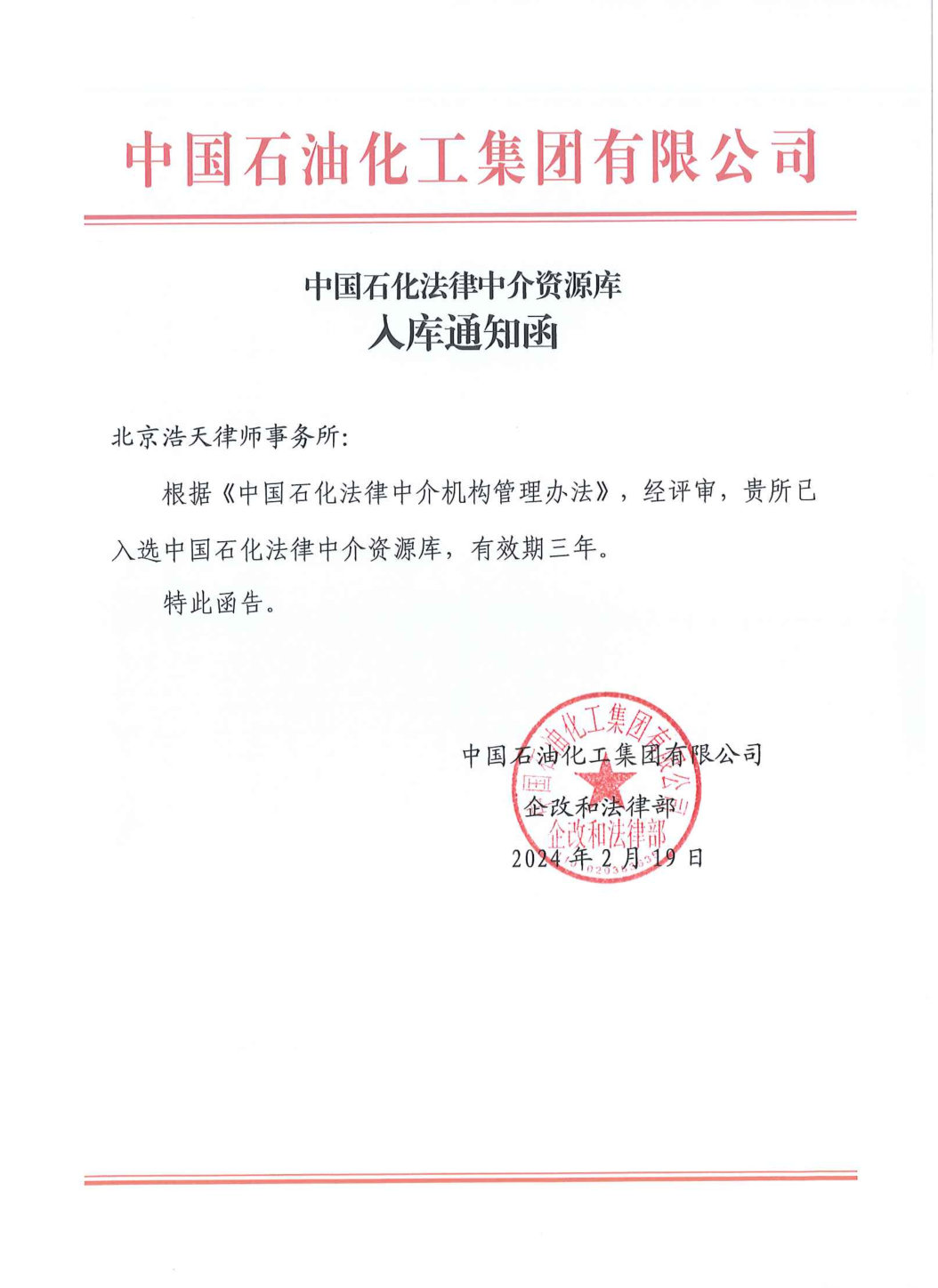 浩天律师事务所成功入围中国石油化工集团有限公司法律中介资源库