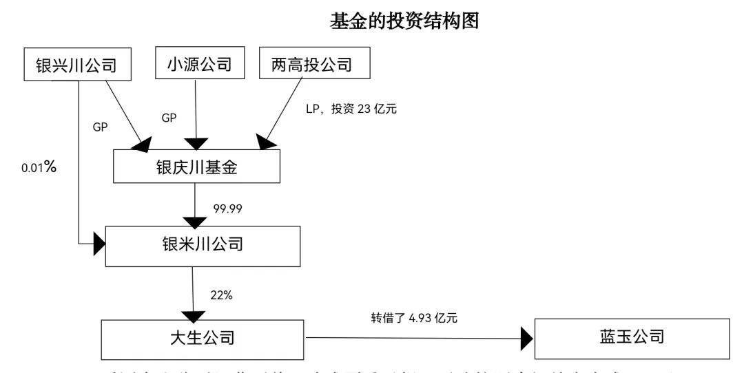 鉴于小源公司仅为基金名义管理人,主要负责的工作仅为帮助基金在中基协完成登记备案手续,并根据基金的实际管理人银兴川公司以及投资决策委员会(5人组成,3人系由银兴川公司委派,2人系由两高投公司委派,以下简称"投决会")指示,将基金定向投资于投决会指定的公司。小源公司在担任银庆川基金的名义管理人期间,已完成基金的登记备案手续,并根据基金投决会指示,将基金定向投资于银米川公司(银米川公司董监高人员与银庆川基金投决会人员混同),银米川公司再陆续将收到的银庆川基金投资款以股权投资及股东方借款的形式分批转投资支付给了大生公司。投资完成后,银米川公司成为了大生公司的股东。后于2019年12月至2020年4月期间,经张某等人授意指示,大生公司将收到投资款中的4.93亿元陆续转借给了蓝玉公司使用。截至2022年7月,蓝玉公司已还清了上述所借款项。