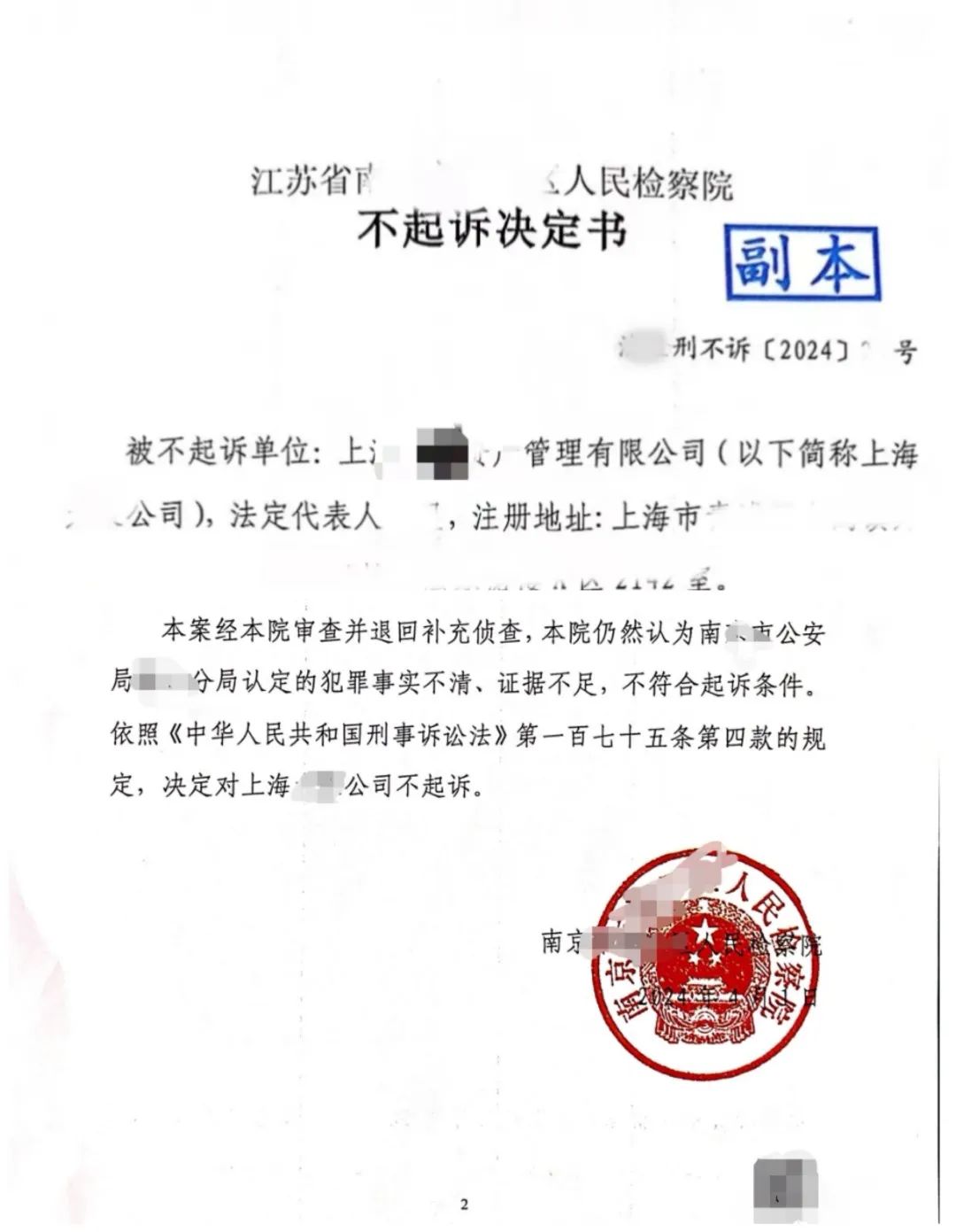 经过承办律师与检察官在长达1年半的时间里不断沟通、交换意见、探讨相关类案处理方式等努力下,案件终于朝着有利于小源公司的方向进行下去。2023年5月,检察院将该案件进行分案处理,将银兴川公司董监高人员5人以“职务侵占罪”、“挪用资金罪”、“非国家工作人员受贿罪”三项罪名向法院提起公诉,但对小源公司及其董事长宋某未决定如何处理。2023年11月,检察院对宋某解除取保候审强制措施,但仍未对小源公司及宋某决定不起诉。2024年4月,检察院经报院检委会审议讨论后,终于决定对小源公司及宋某均不起诉,同时出具《不起诉决定书》。至此,小源公司及其董事长宋某的危机终于得到正式解除,公司及董事长个人均得以保留无刑事犯罪记录的清白之身,今后将本着合法合规的理念,继续经营,为社会创造价值。