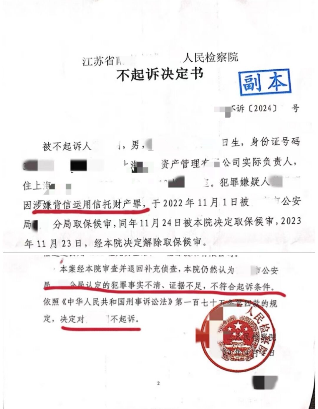 浩天为涉嫌“背信运用受托财产罪”的私募基金公司辩护成功获得不起诉决定书