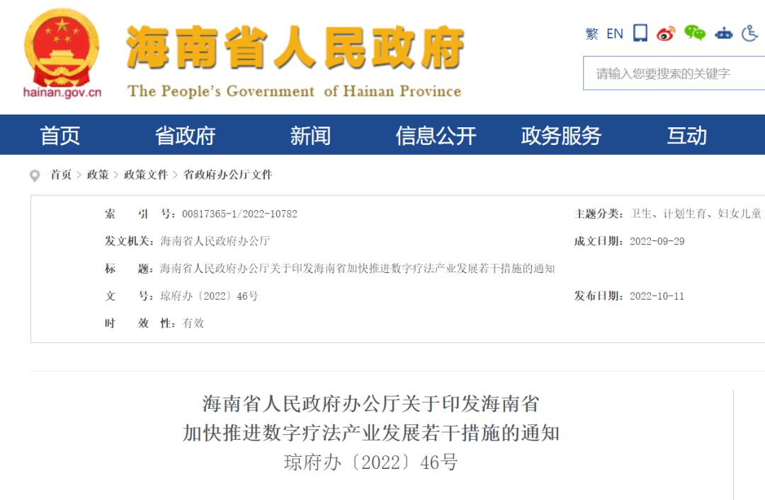 2022年10月11日,海南省人民政府办公厅发布《海南省加快推进数字疗法产业发展的若干措施》,北京浩天律师事务所健康与生命科学团队合伙人颜麟、李延龙律师、团队成员白玉婧律师等作为海南省数字疗法的专班成员,深度参与了海南省加快数字疗法相关措施的研讨、制定、意见修改等方面的工作。