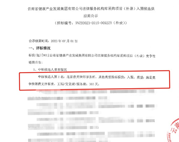 2023年7月3日,北京浩天律师事务所(以下简称"浩天")在与多家享誉业内的知名律所的激烈角逐中,凭借卓越的业绩、优秀的团队、专业的服务方案,在浩天中台的协助下,经过评标专家的初步评审、磋商、详细评审等综合评审,以综合得分第一名的成绩成功入围“云南省健康产业发展集团有限公司法律服务机构库采购项目”。