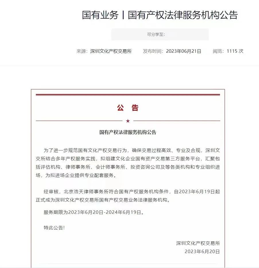 北京浩天律师事务所入选深圳文化产权交易所国有产权交易法律服务机构