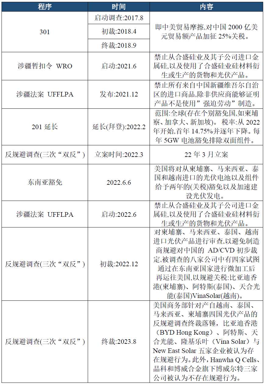 针对中国光伏产品的产业转移,美国为保护自己的本土光伏产业,开始启动针对全球和主要光伏产业基地所在国的相关贸易保护措施以及限制在中国之外的生产基地中产品的中国元素,包括全球保障措施调查(201调查)、301调查、反规避调查和涉疆法案调查。