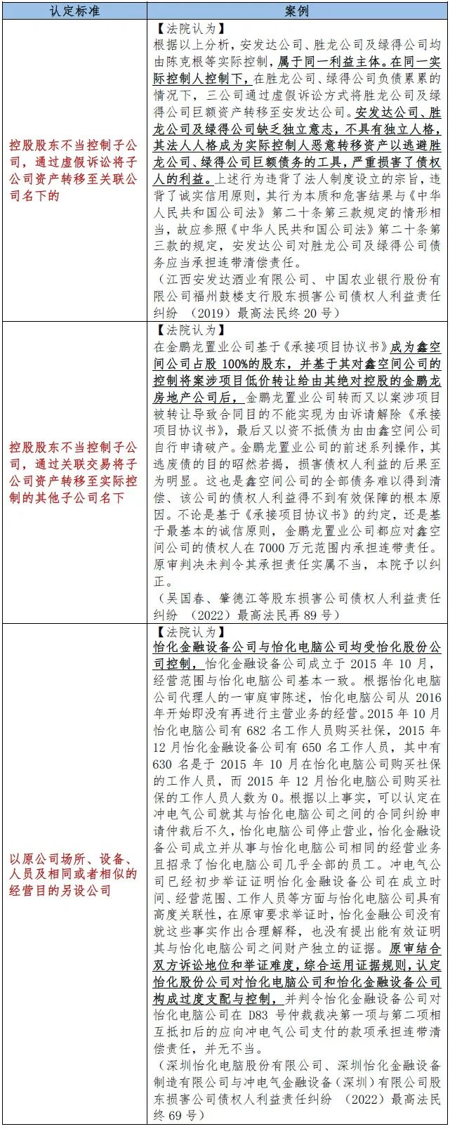 司法实践中法人人格否认的认定通常涵盖了几种典型情况,包括人格混同(详见《九民会议纪要》第十条)、过度支配与控制问题(详见《九民会议纪要》第十一条),以及资本显著不足(详见《九民会议纪要》第十二条)等。这些情形在司法实践中被广泛认可,后续新《公司法》施行,亦会继续将其作为判断法人人格否认的重要类型。