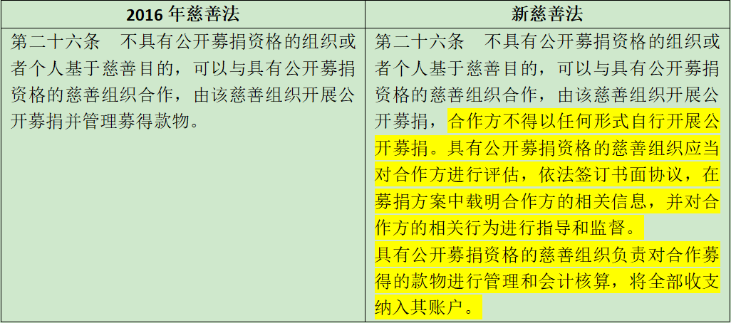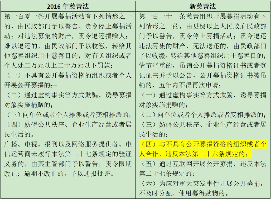 2016年《慈善法》仅规定不具有公募资格的组织或个人开展公开募捐时的处罚,但是没有规定合作募捐下公募基金会的相关责任。新《慈善法》将不具公开募捐资格的组织或个人开展公开募捐的行为单独规定为一条(第一百一十三条)以示强调,更是在第一百一十一条增加一款,公募基金会与不具有公募资格的组织或者个人合作,违反本法第二十六条规定,要对公募基金会进行处罚,情节严重的,甚至会吊销公募资格证书。