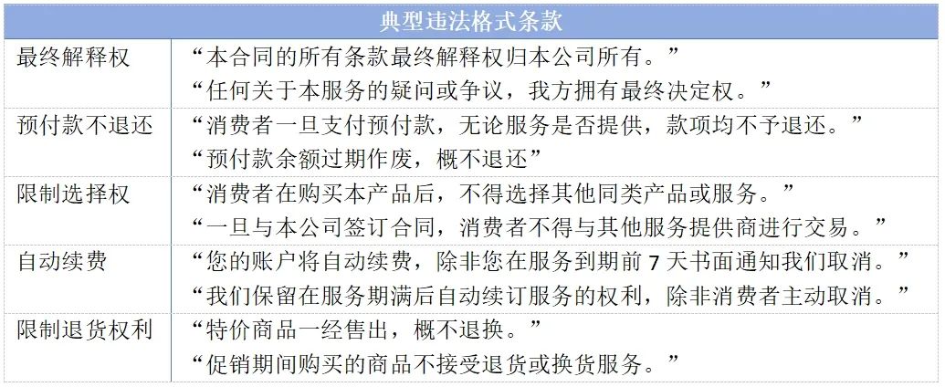 合规的格式条款应内容清晰明了、语言简单易懂、条款公平合理,并通过合理的标识和位置安排,使消费者能够轻松注意到并理解其含义。除了内容本身对消费者不公平外,若格式条款存在形式上令人难以理解,语言晦涩或含有专业术语,标识和位置安排不合理等情况,则具有违法违规的风险。
