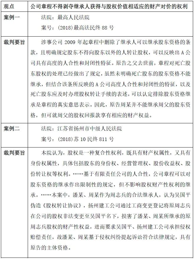 此外,公司章程对股东资格继承的限制应当合理,不得违反继承法的基本原则,剥夺继承人获得与股权价值相当的财产对价的权利。要注意保护公司利益、其他股东利益、已去世股东生前的意愿以及继承人利益之间的协调与平衡。