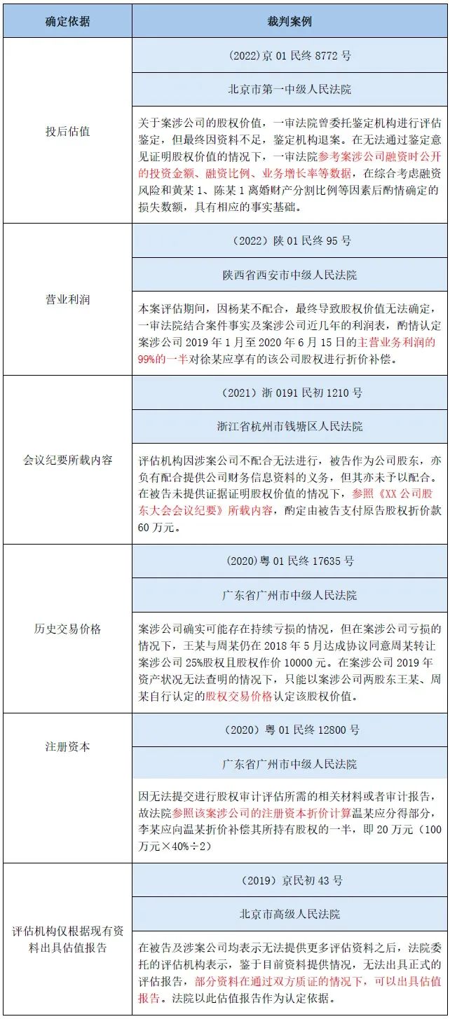 从近年裁判案例来看,在涉及股权分割的离婚案件中,若因持股方不配合导致评估程序无法推进,法院通常不会强制评估,而可能会采用包括投后估值、营业利润、历史会议纪要数据、历史交易价格、注册资本等替代性数据作为确定股权价值的依据,而选用不同的替代性数据,对股权的折价影响也不相同。具体案例请见下表: