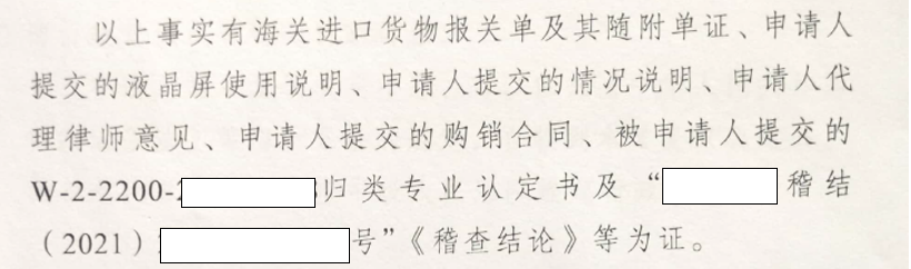 本案审理过程正值疫情管控期间,根据防疫要求,异地律师无法进入海关工作场合,故经各方协调,采取了视频交流的方式。虽然并未明确系听证,但所有程序均按照听证程序进行。可以说,复议机关的审理程序是完备的,但即使如此,直至看到《复议决定书》,企业和我们才了解到还存在一份海关总署税管局归类认定的证据。被申请人没履行举证义务,申请人没机会质证,更无从向复议机关主张对该证据的意见。