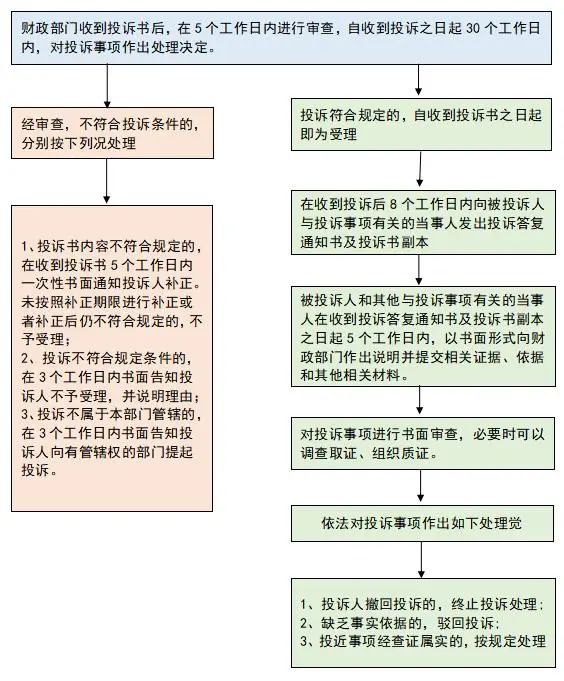 投诉人在法定时间内将投诉书递交向同级财政部门,财政部门经过审理确定受理的,需要按照以下审查流程进行审理。