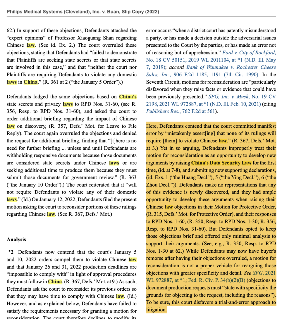 本案被告昆山一元医疗科技有限公司和昆山国立电子科技有限公司(统称“被告”)要求重新审议本法院关于原告文件出示请求(“RPD”)号的命令的动议。具体而言,被告对法院关于中国法律对其发现义务的影响的裁决提出质疑。在该案证据开示阶段,原告要求被告提供中国公司员工手机中与案件相关信息等证据,被告以《国家秘密法》、《个人信息保护法》、《数据安全法》对国家秘密、个人信息、数据出境存在严格限制为由,申请法院出具对该等个人信息、数据的保护令,拒绝向原告提供。
