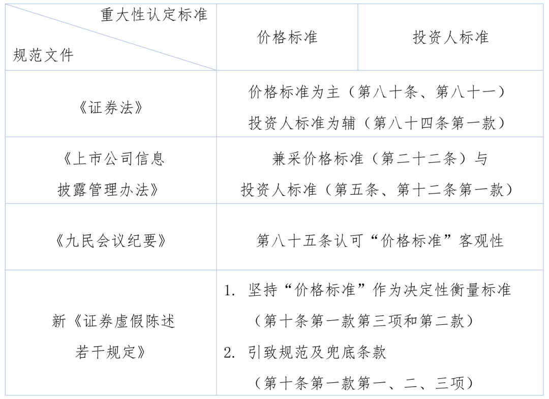 《证券法》对于证券虚假陈述重大性的界定采取主、客观相结合的二元化判断标准,以“价格标准”为主、兼顾“投资人标准”: