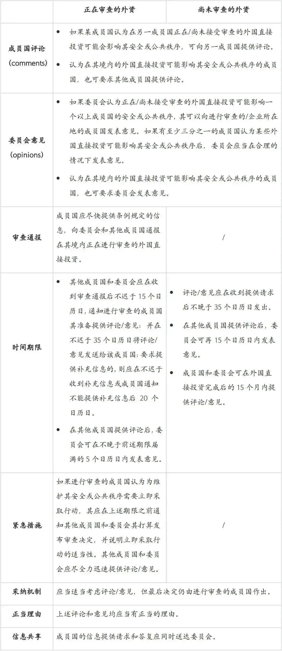 1. 审查目的及审查对象。根据《欧盟外商投资审查条例》第一条,该条例的出台主要是为了规制可能影响安全或公共秩序(security or public order)的外国直接投资,并就外国直接投资审查在成员国之间、成员国与委员会之间建立合作机制(mechanism for cooperation)。