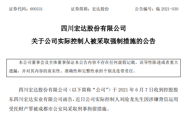 随着金融理财业务的发展,金融机构擅自运用客户委托资金或财产的案件时有发生,但往往只能对相关人员以挪用公款罪、挪用资金罪等定罪处罚,直至2006年《刑法修正案(六)》出台,其通过《刑法》第185条之一的规定,新增背信运用受托财产罪,专门用以规制商业银行、证券交易所、期货交易所、证券公司、期货经纪公司、保险公司或者其他金融机构,违背受托义务,擅自运用客户资金或者其他委托、信托的财产的行为。但该罪名一直以来鲜少适用,裁判文书也是屈指可数。但随着2018年《资管新规》的出台,监管部门对于金融市场的乱象持续加强监管力度,而随着“大资管时代”的到来,刑事追责将可能更加深入和明确,而背信运用受托财产罪也可能因其适应监管的规制模式而得到更多的适用,比如四川宏达股份有限公司(宏达股份,600331.SH)发布公告称,2021年6月7日收到控股股东四川宏达实业有限公司函告,“近日公司实际控制人刘沧龙先生因涉嫌背信运用受托财产罪被成都市公安局采取刑事拘留措施”,据悉,刘沧龙为四川信托的实际控制人。2020年6月,四川信托产品出现大量逾期,此后,四川信托因存在大股东挪用项目资金的违规行为被四川银保监局处罚。