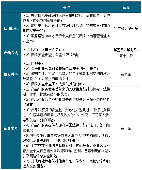 2021年12月28日发布,2022年2月15日实施的《网络安全审查办法(2021)》(以下简称“《2021版办法》”)将保障网络安全和数据安全纳入规制目标。在《2020版办法》的基础上,《2021版办法》新增两项适用情形,包括:1、网络平台运营者开展数据处理活动,影响或者可能影响国家安全的;2、掌握超过100万用户个人信息的网络平台运营者赴国外上市。相应地,《2021版办法》在审查要素上新增了对核心数据、重要数据、大量个人信息的安全和是否会被外国政府控制等事宜的相关规定。