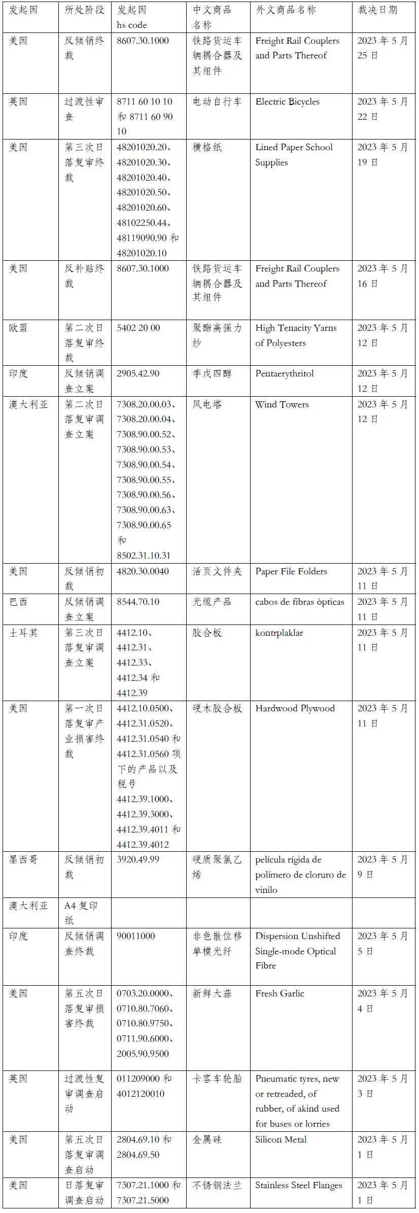 2023年5月贸易救济“出口应诉”动态更新汇总