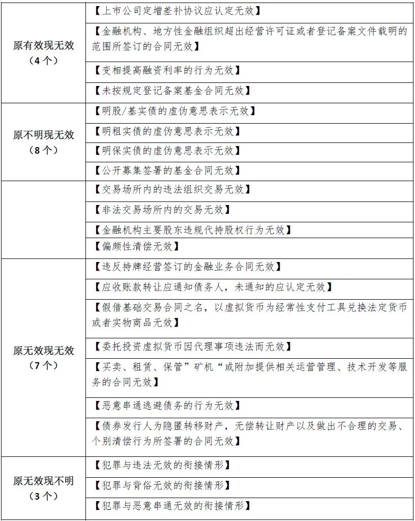 在此次的网传版《金融审判会议纪要》(征求意见稿中)(以下简称“《金融纪要》”[4]中,“无效”作为高频词汇出现了近 80 余次,主要分布在 22 个条款中(见附表一)。本文将围绕这 22 个无效合同条款并以《金融纪要》为时间分割线,将“无效合同”分为四大类别进行讨论,分别为原为有效合同而现为无效合同、原为效力不明合同而现为无效合同、原为无效合同现仍为无效合同,以及原为无效合同现效力不明的合同。本文通过梳理本次会议纪要规定,对比现行司法实践对其进行解读和分析,以期共同探讨交流在强监管之下的金融“无效合同”的司法裁判新规则,也希望为正式版的《金融审判会议纪要》的出台提供刍荛之见。