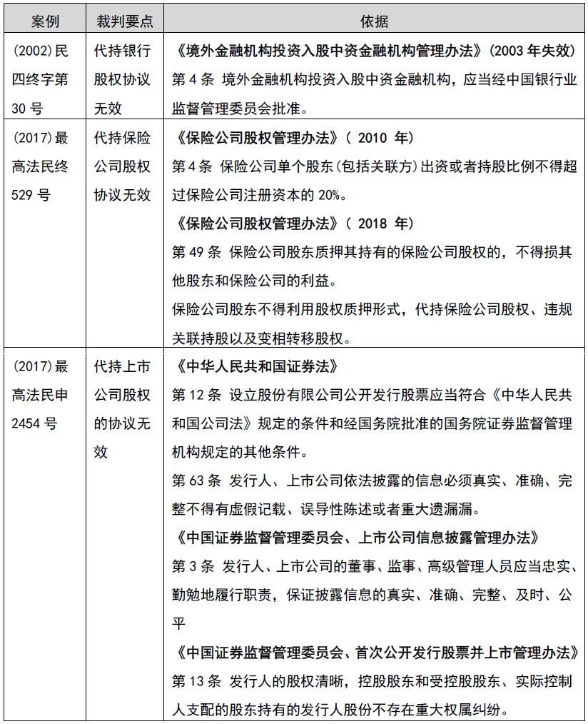 金融审判会议前,对于涉及金融机构主要股东的股权代持行为存在很大争议。最高院分别在(2021)最高法民终397号、(2002)民四终字第30号、(2017)最高法民终529号以及(2017)最高法民申2454号三个案例中认定了股权代持协议无效。详见下图。