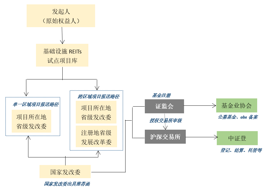发行基础设施的项目是由发改委和证监会两个部门共同主管,共同审议,主要申报流程如下图所示: