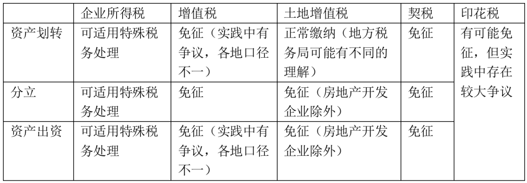 《财政部、国家税务总局关于企业改制过程中有关印花税政策的通知》(财税〔2003〕183号)规定:“企业因改制签订的产权转移书据免予贴花”。但实践中,各地税务局对财税〔2003〕183号的理解和适用存在很大的分歧。部分地区税务局认为该规定只适用于国企改制,且交易形式必须是该规定列明的类型:公司制改造、合并、分立和债转股。如果是这样理解,上述三种资产重组方式可能都难以适用财税〔2003〕183号规定,企业需缴纳印花税。